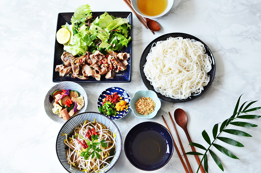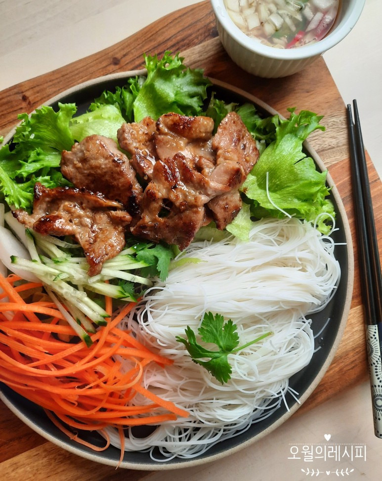 쌀국수와 구운 돼지고기, 신선한 채소가 어우러져 독특한 맛과 향을 자랑합니다.